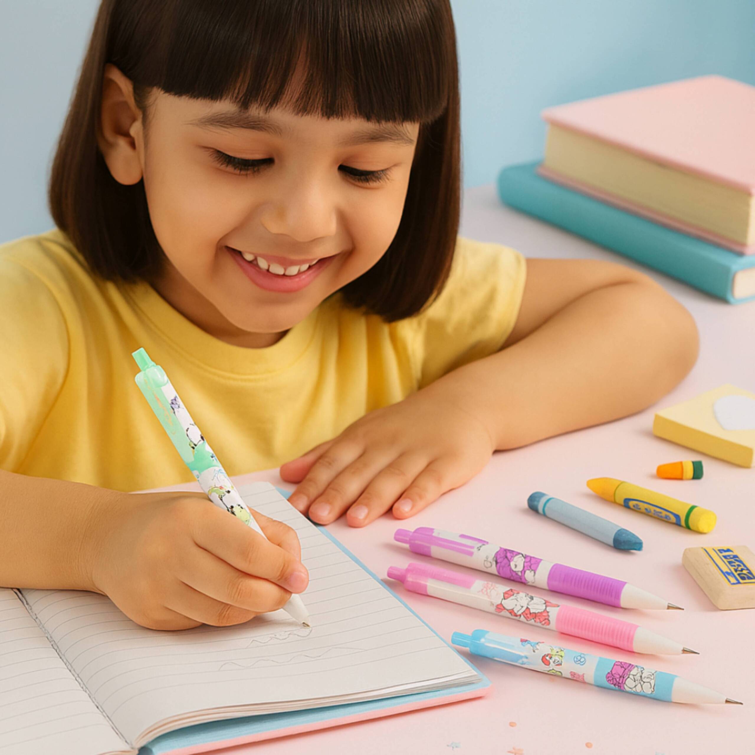 Brighten up your writing with this fun set of 4 colorful mechanical Clutch pencil in Pink, Blue, Purple, Green, brown and yellow colours– each featuring adorable cartoon prints kids and teens will love!🖊️ Smooth Writing, 0.7mm Lead