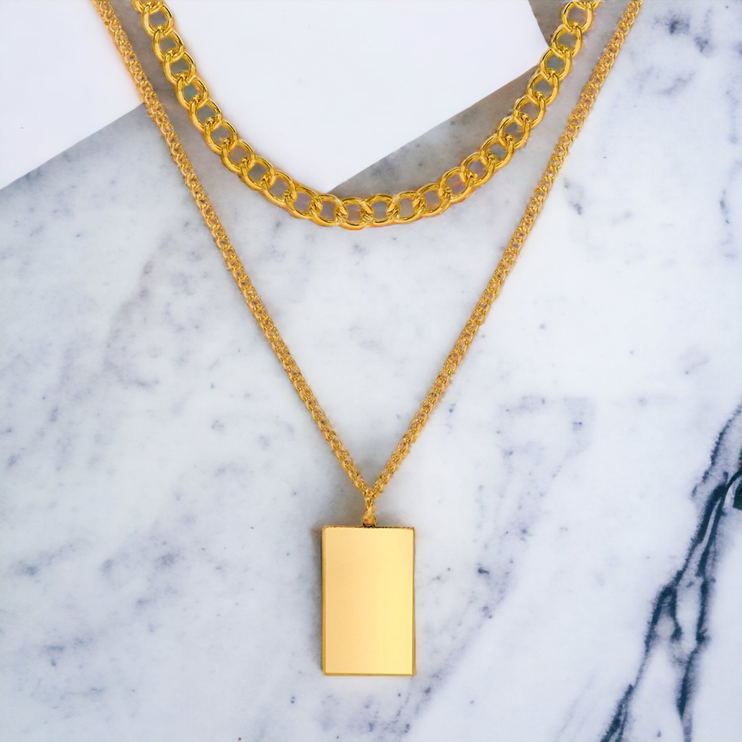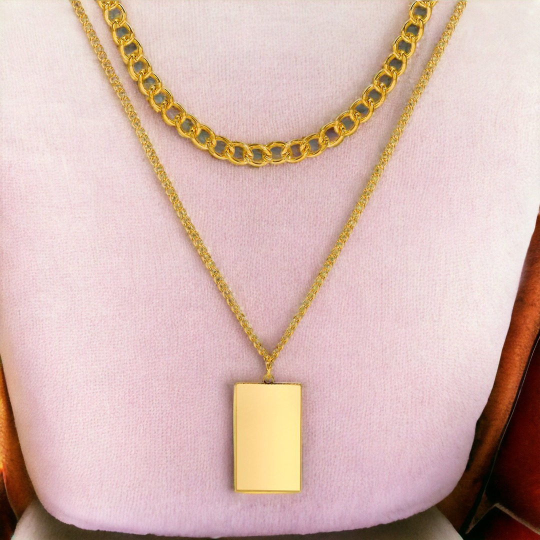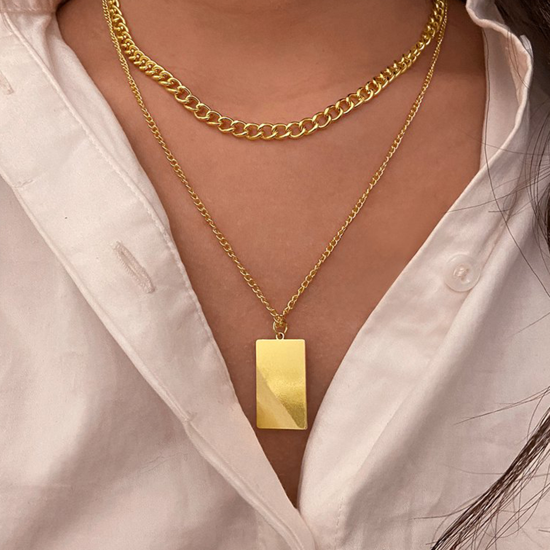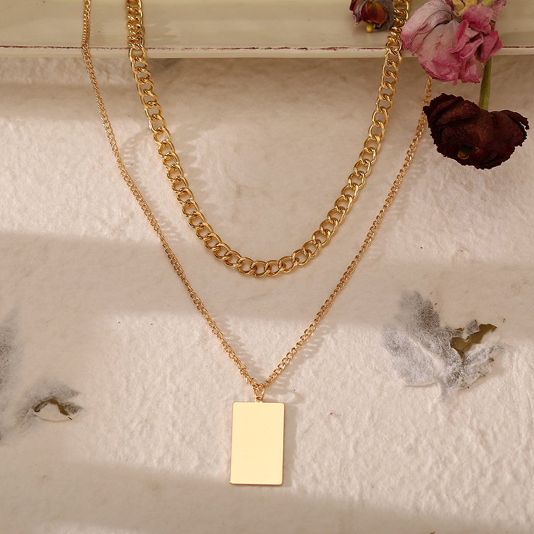 Elevate your style with our exquisite double-layer gold chain necklace adorned with a stunning flat pendant. A must-have accessory that effortlessly combines elegance and trendiness.