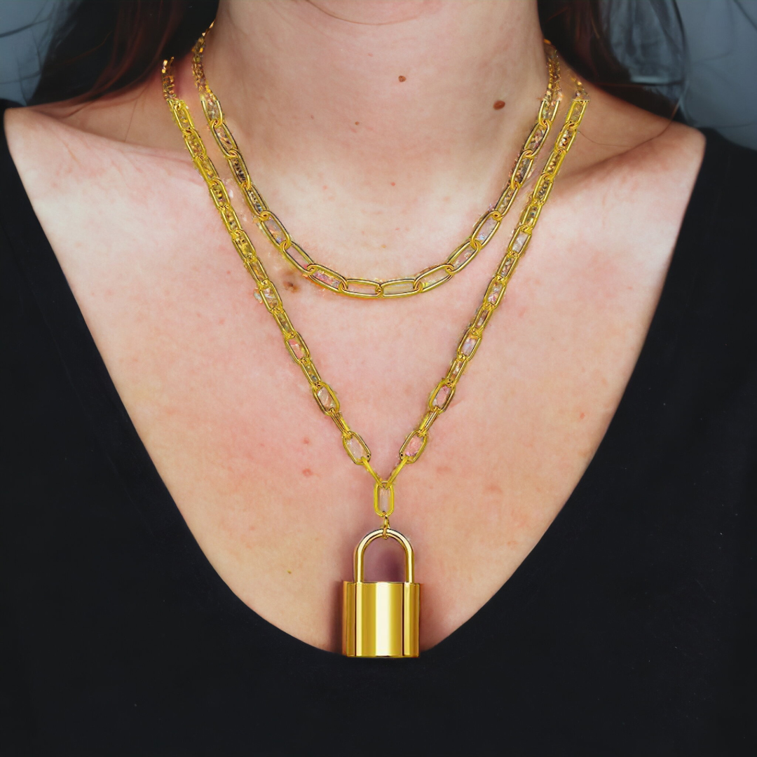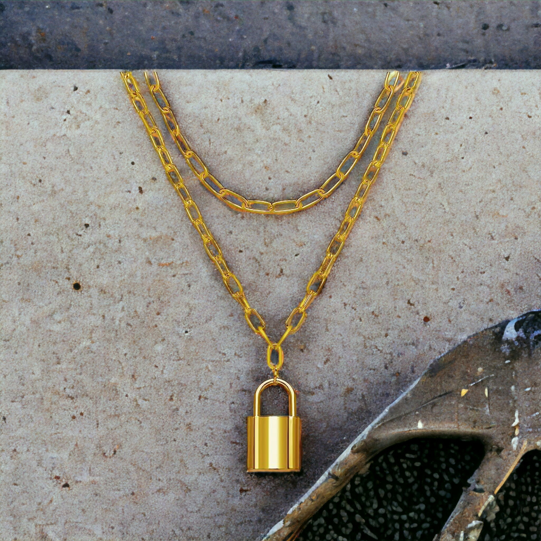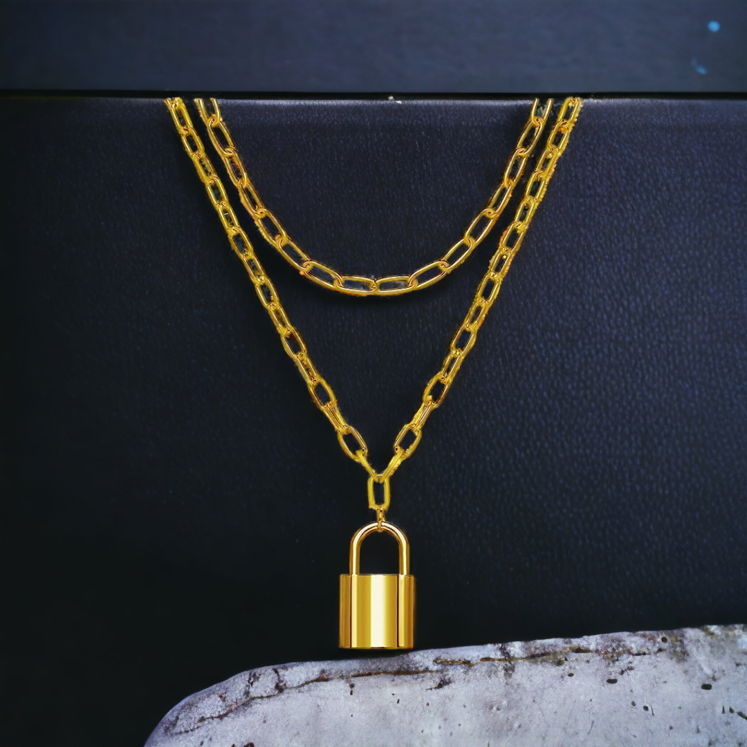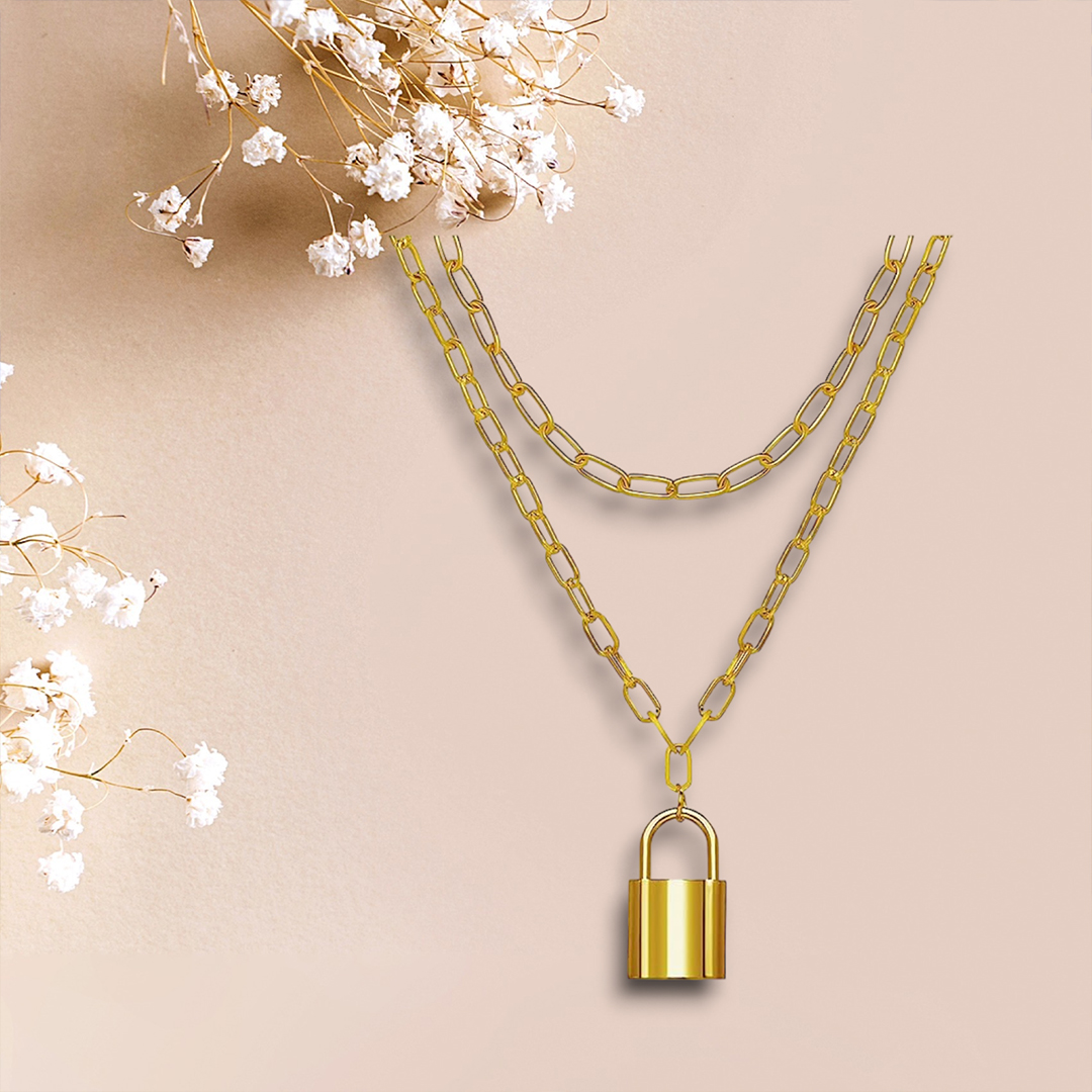 Featuring a lustrous gold lock pendant suspended on a link chain, this necklace adds a touch of elegance to any ensemble. The high-quality craftsmanship ensures durability, making it a lasting investment for your wardrobe.