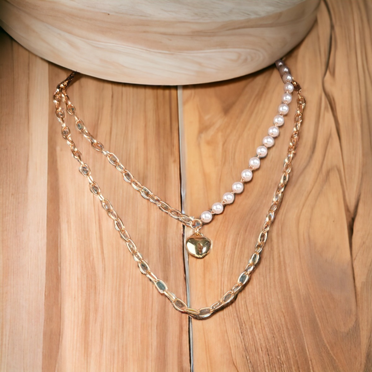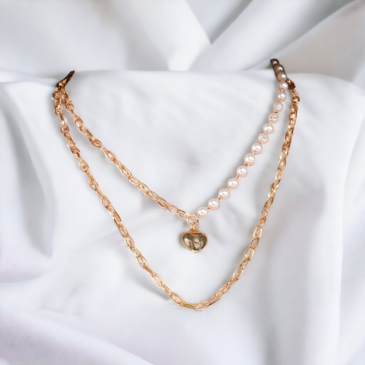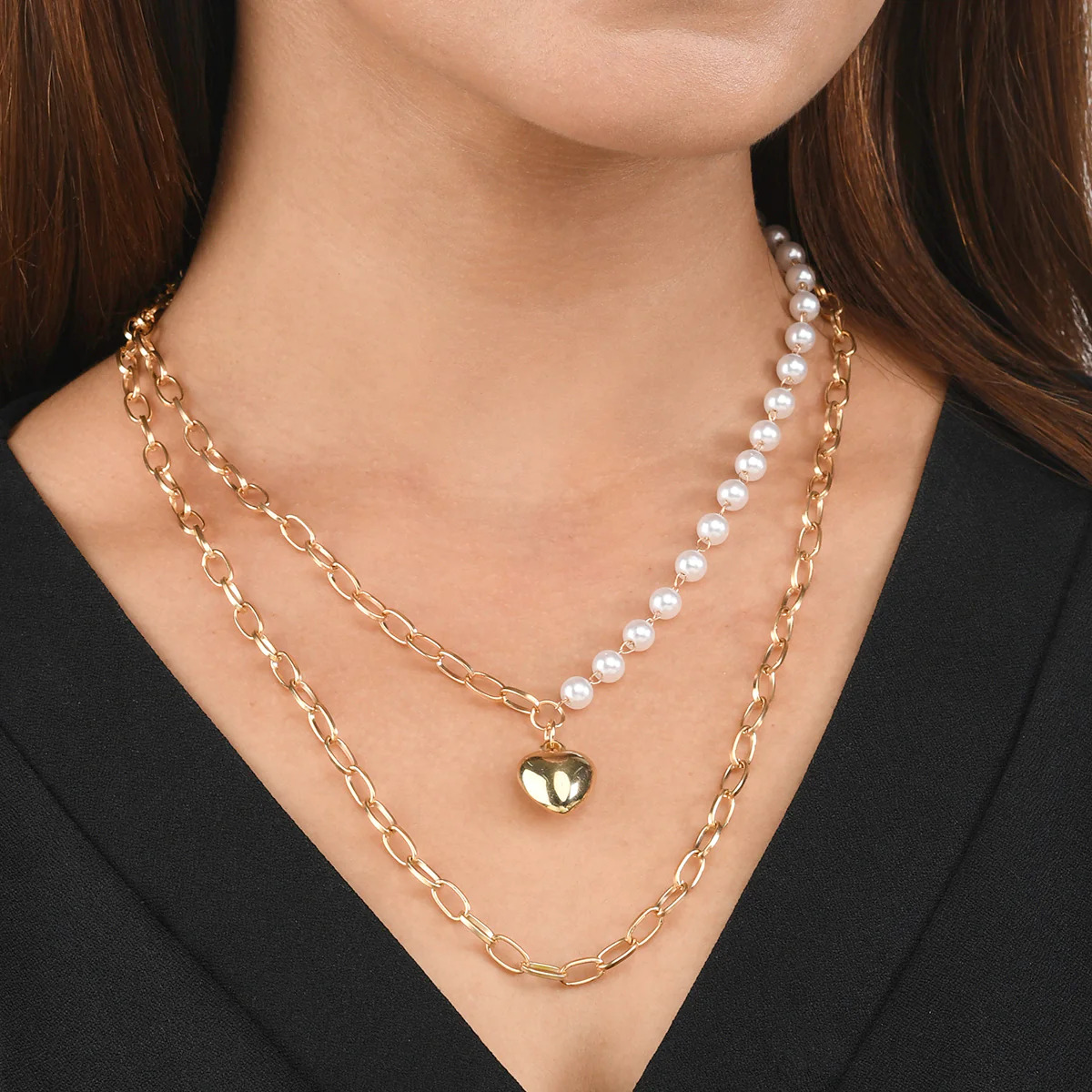 Made with faux pearls and a delicate heart-shaped pendant, this necklace exudes elegance and sophistication. The beautiful necklace is double layered with one link chain and other with pearls, making it quite a fashion statement.