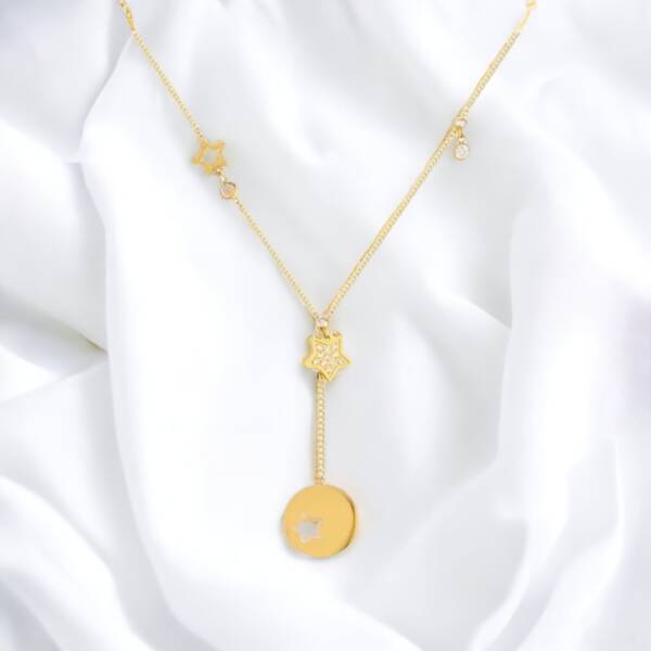- Featuring a unique hanging pendant design, the main focal point of the necklace is a round coin with a star cutout. A dazzling star, studded with cubic zirconia stones, is positioned at the point where the pendant hangs, adding extra shine and elegance to the piece. On the right side, a small cubic zirconia stone charm dangles, while on the left side, there is a star cutout in the middle of the chain.